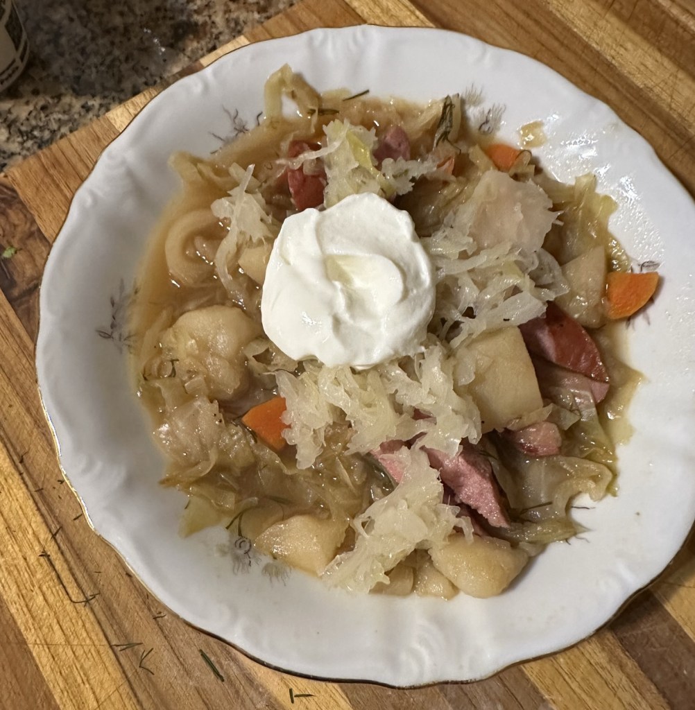 As recommended, I served the soup topped with sauerkraut and sour cream. It might seem like overkill to add sauerkraut to cooked cabbage, but it adds a nice extra tang. I include sauerkraut when I make stuffed cabbage, so it doesn’t feel odd to me.
