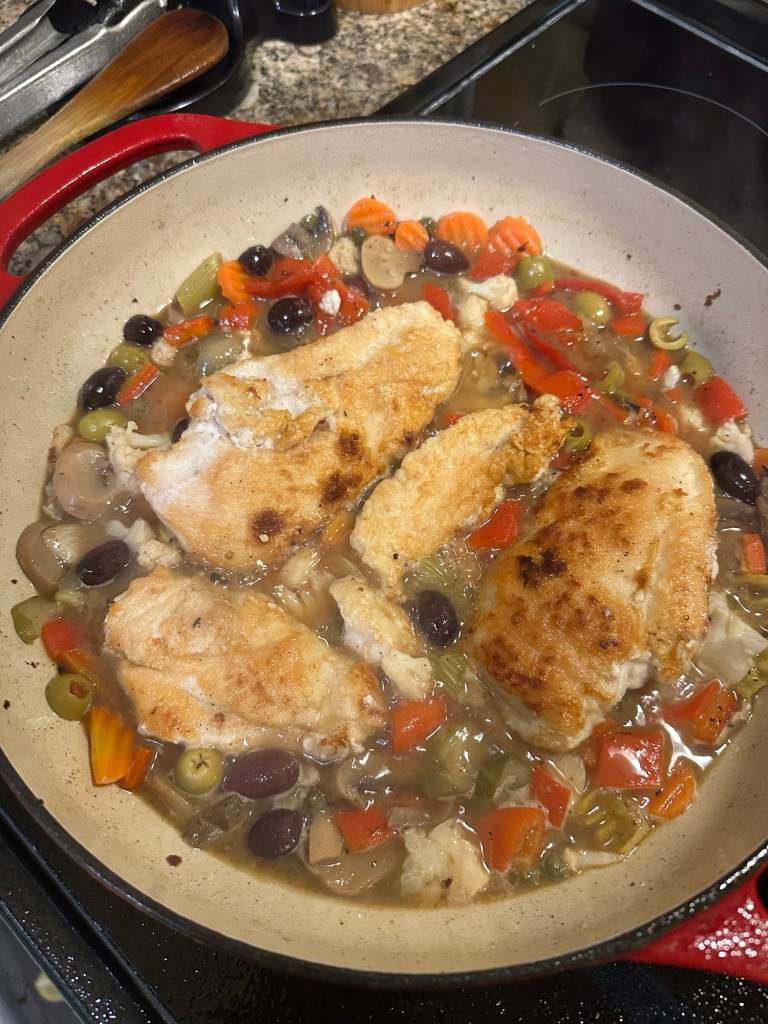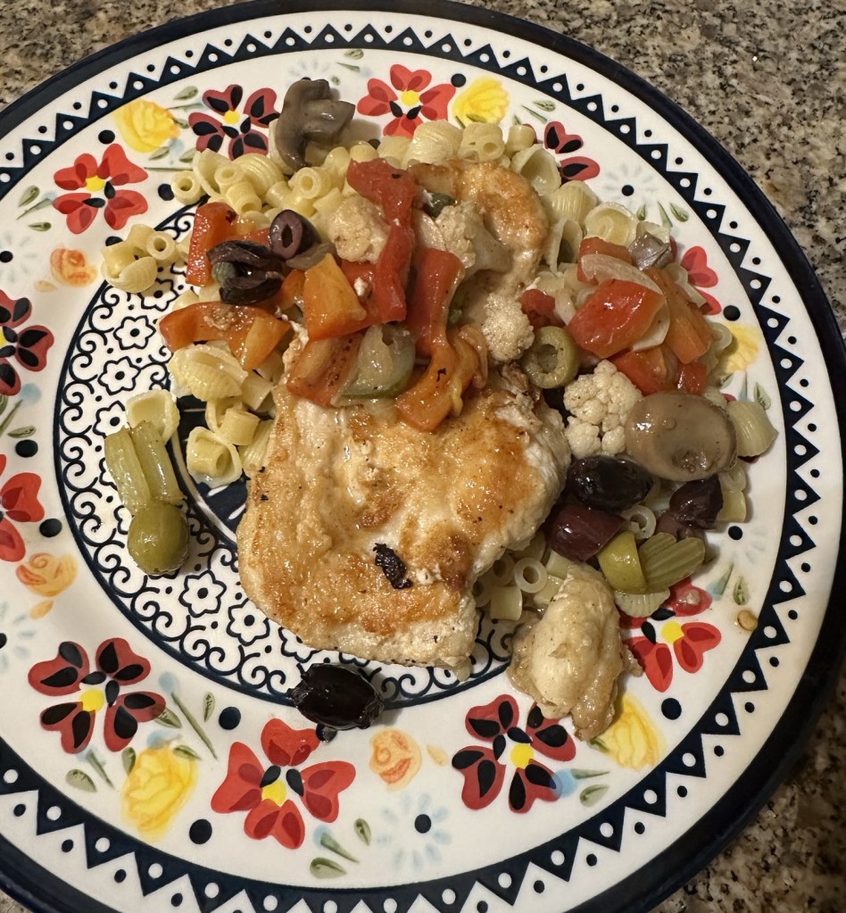 I had printed out the recipe for Antipasto Chicken Skillet several months ago. It appeared in the Washington Post, developed by nutritionist Ellie Krieger. I’ve made several of her recipes in the past and enjoyed them. They’re healthy and well balanced. This looked appealing, and it’s been in my mental “I want to try this” file since I first read it.