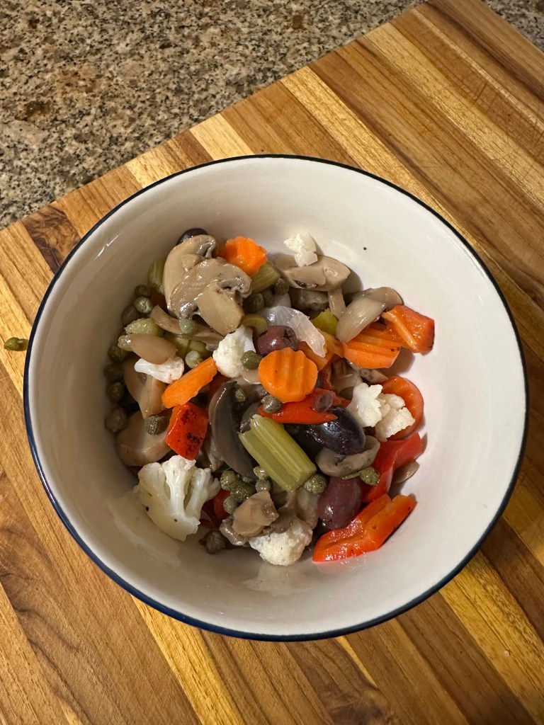 I started with a cup of giardiniera for my veggie mix. I coarsely chopped the larger cauliflower pieces, but the remaining vegetables were small enough that I didn’t feel the need to chop them further. I had a jar of roasted peppers, so I coarsely chopped a large pepper. In went some jarred sliced mushrooms, plus manzanilla and Kalamata olives and a generous spoonful of capers.
