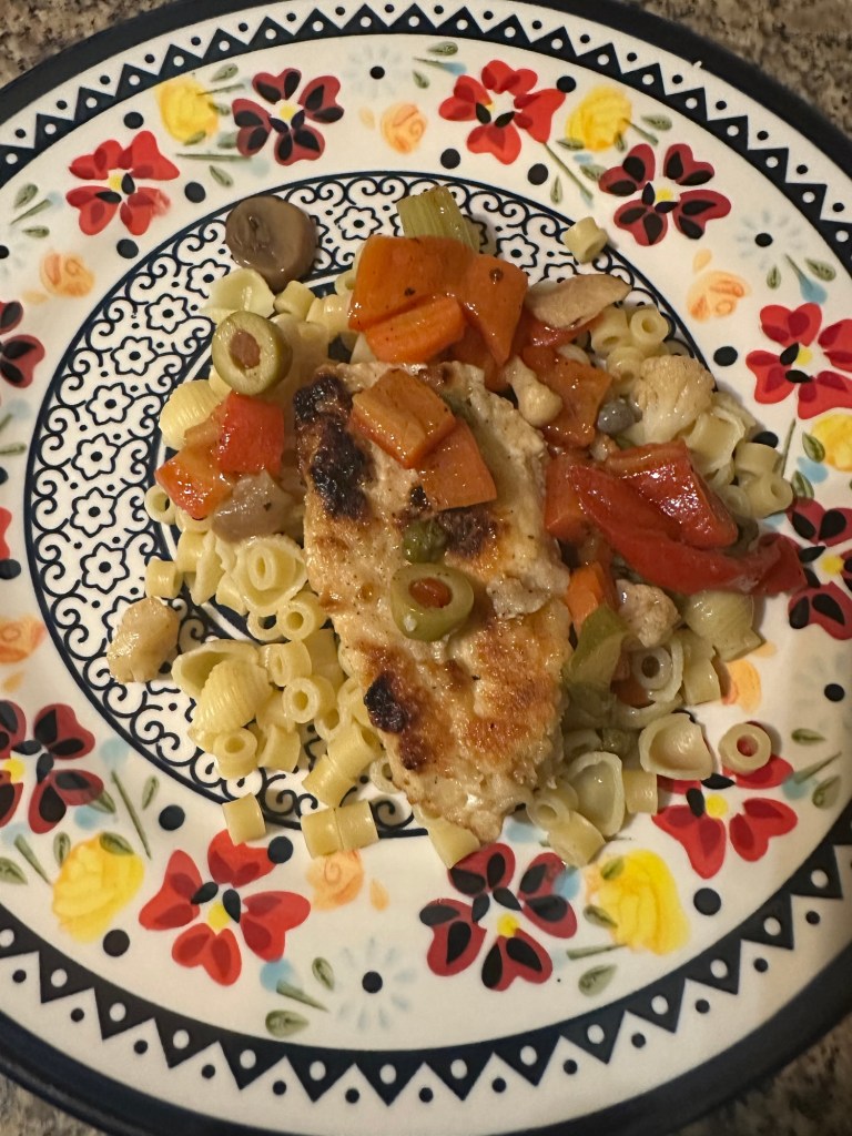 It’s a very vegetable-forward recipe; it’s essentially chicken breast cutlets with a vegetable topping. It calls for any mix of drained jarred vegetables, and lists as possibilities roasted red peppers, artichoke hearts, sun-dried tomatoes, mushrooms, olives, or capers. The first thing that came to mind when I read that was giardiniera, the Italian pickled vegetable dish that is a traditional part of antipasto. (Chicago style giardiniera is different, as it’s oil-based and spicier, meant to be used as a condiment). I knew that was where I wanted to start.