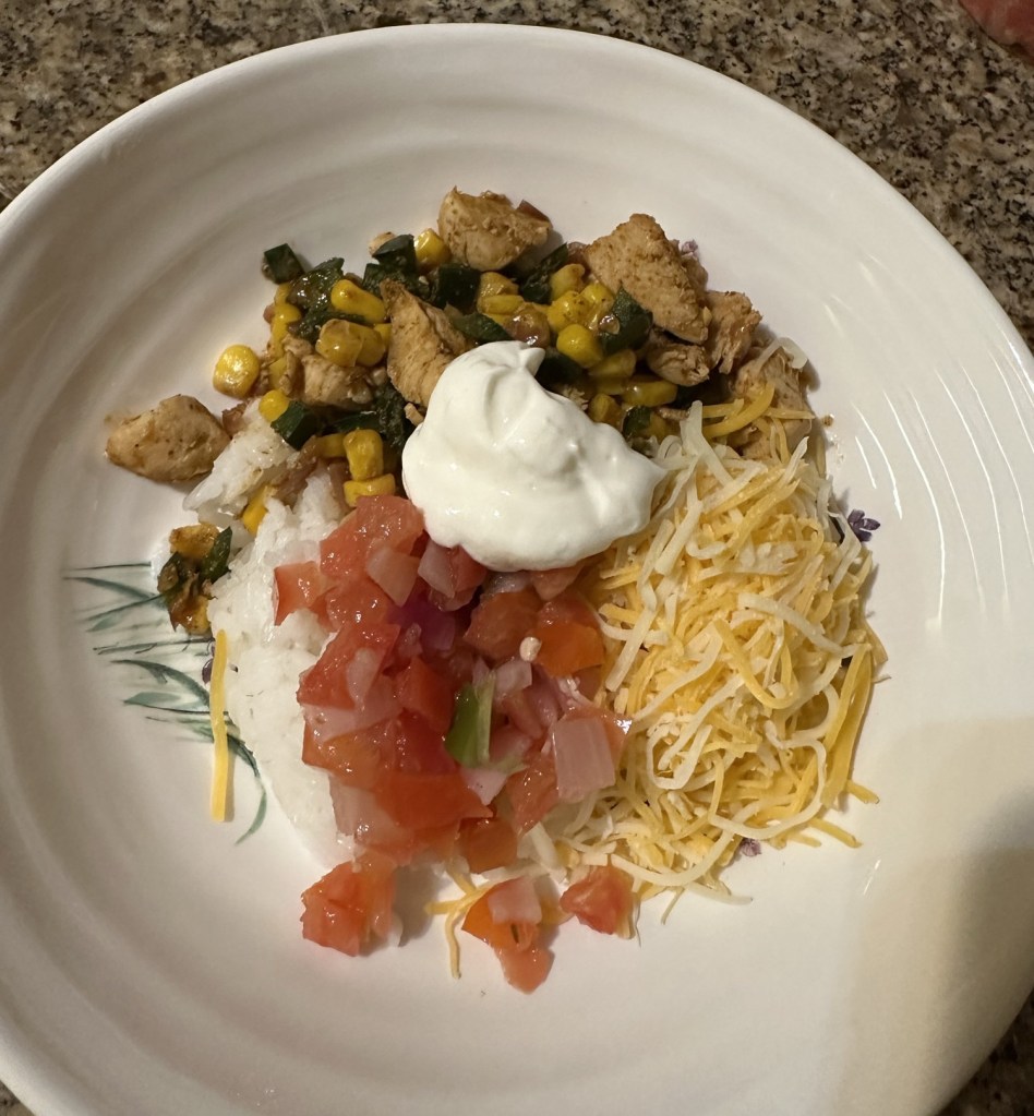 The chicken portion of the bowl is essentially a stir fry. I made the taco seasoning recipe that Gina includes, because i realized that, despite the dozens of bottles in my spice drawer, I had no taco seasoning. You can, however, use commercial seasoning. She also includes the ingredients for pico de gallo in the recipe, but that’s something we often have in the fridge, and that’s what I used. The chicken-vegetable mixture, pico de gallo, and some shredded cheddar-jack cheese goes on top of the rice base. The recipe calls for brown rice, but only one of us likes brown rice 🙄, so I used white rice. I suppose you could substitute cauliflower rice for a low-carb option, but I prefer cauliflower that looks like cauliflower. Reduced fat sour cream is an optional topping, and we each opted to add a spoonful. It was a good addition.