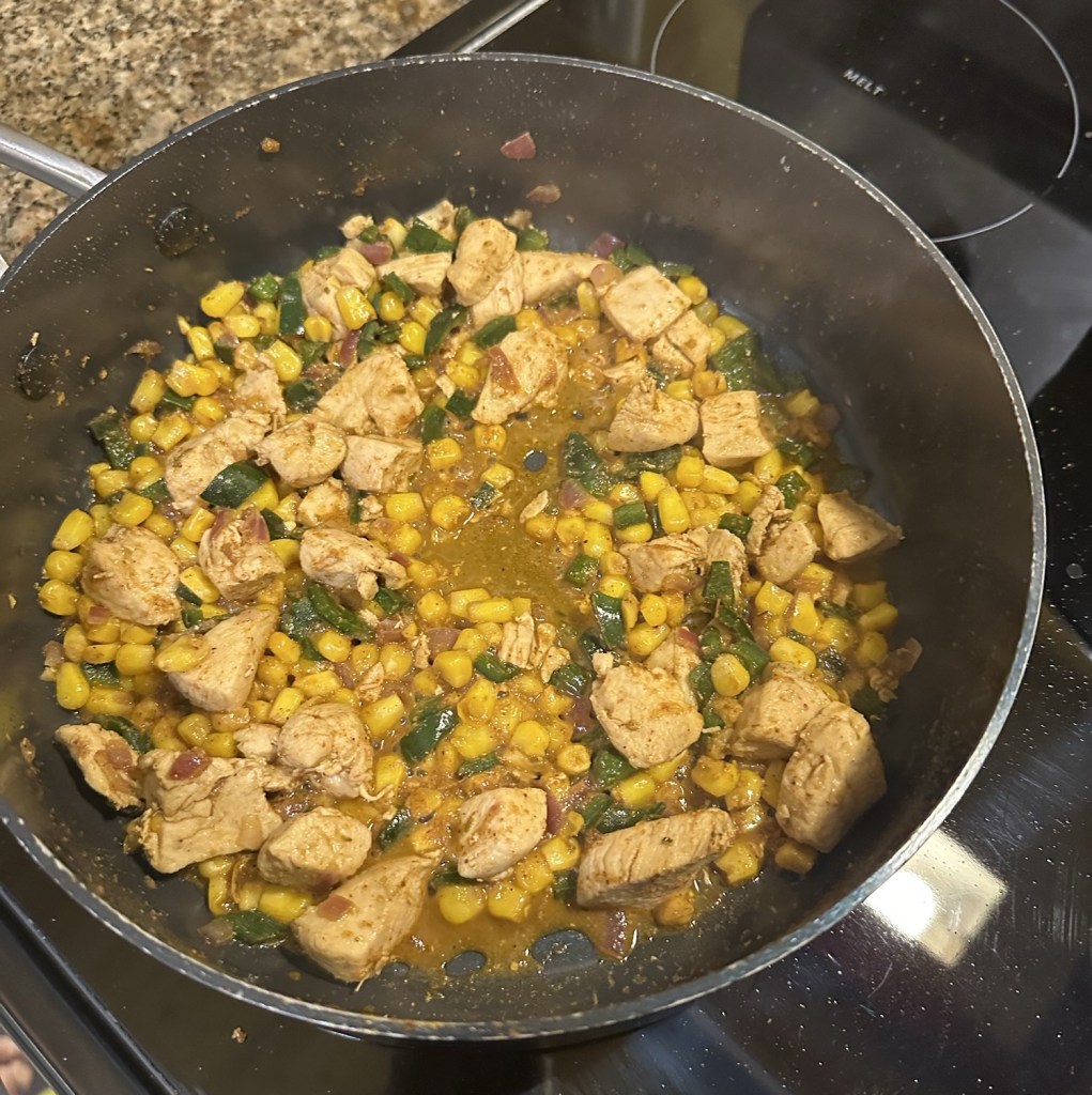 Add the onion, poblano, and taco seasoning to the skillet and cook until the vegetables soften, 2 to 3 minutes. Add 1/2 cup water and corn. Cook 1 to 2 minutes, then remove from heat.