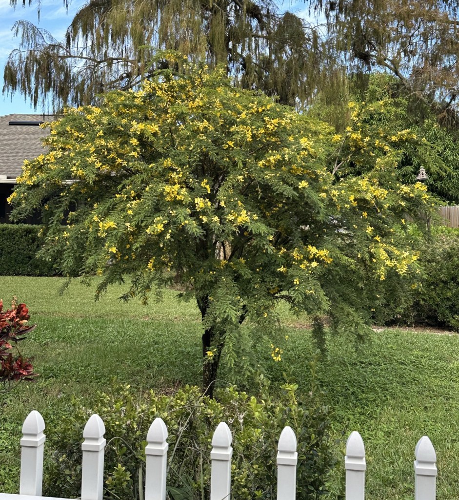 I love this view when I look out into our backyard right now, because the desert senna is in bloom.