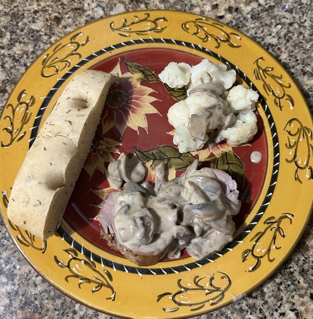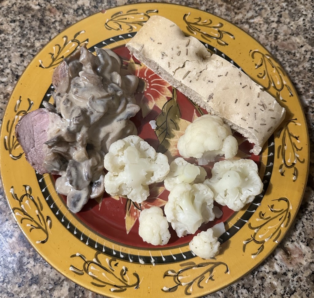 Ken requested cauliflower for a side. I usually serve this with noodles, but I found some bake-at-home rosemary focaccia when I was in Publix, and that worked nicely. It was kind of a monochrome meal, but a tasty one.