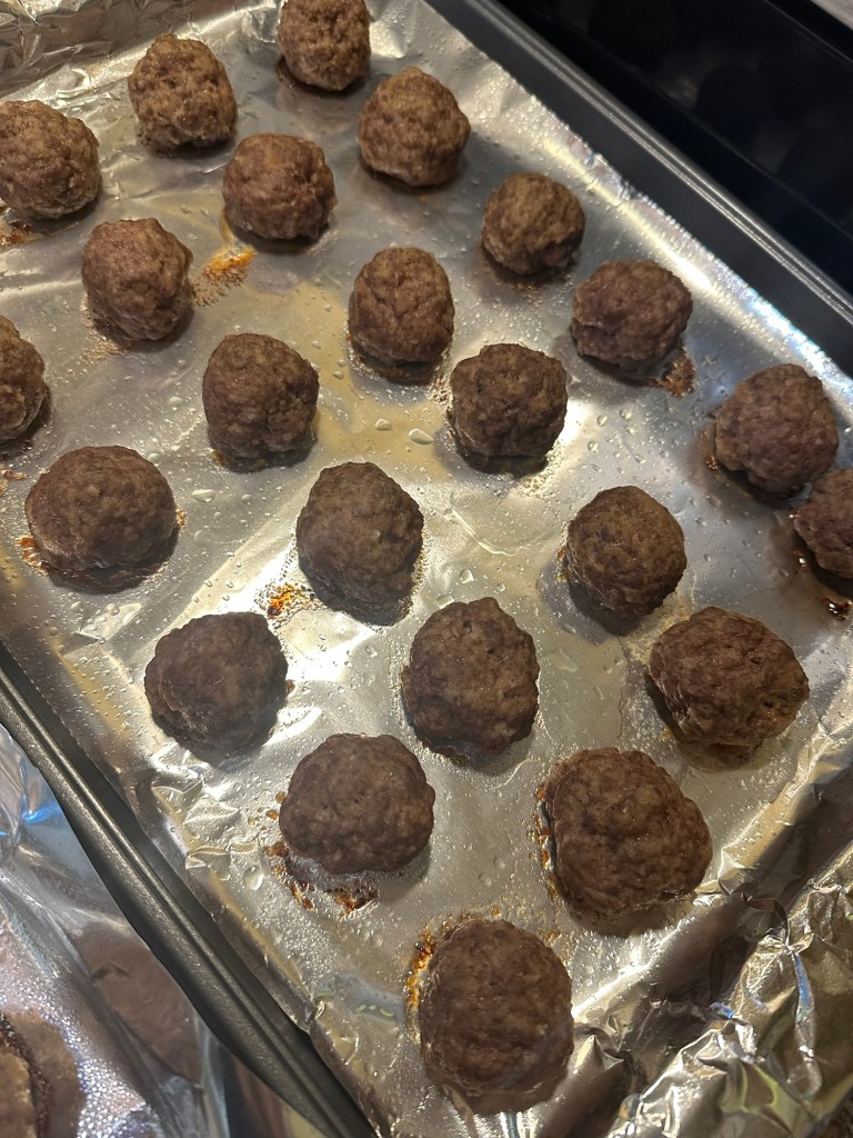 The dish is a pretty basic one, but delicious nonetheless. I’ve made a couple changes over the years. The original recipe calls for MSG. Uh, no. I also now bake the meatballs, rather than brown them on the stovetop. That’s a technique I learned from The Complete Meatball Cookbook by Ellen Brown. It’s really useful here, because the meatballs are rather soft, and tend to fall apart as you try to turn them in the pan. Baking solves this issue.