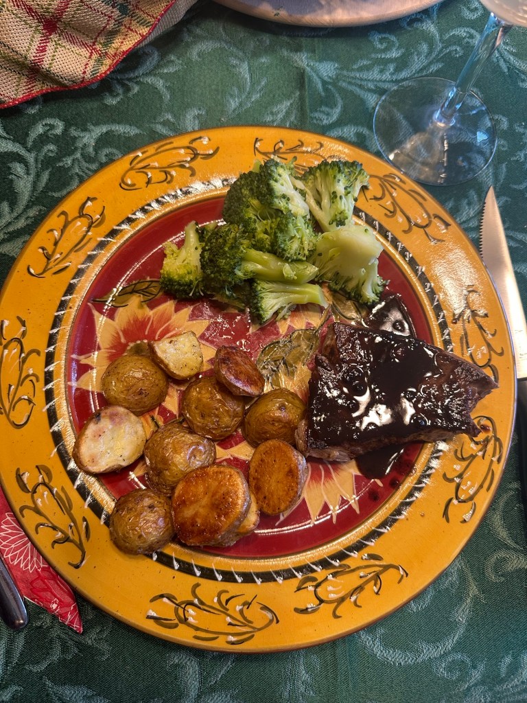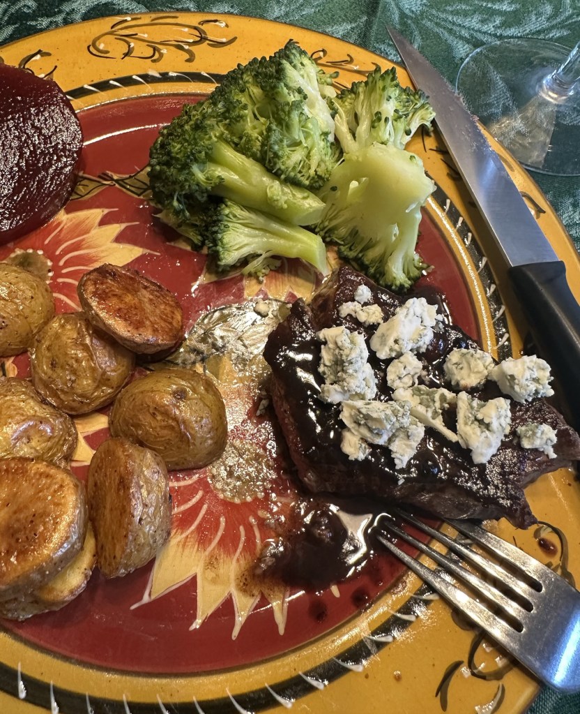 I served the steak with roasted potatoes and steamed broccoli, plus the remaining cranberry sauce. But when I carried the plates to the table, Ken looked at it and asked, “where’s the cheese?” I had forgotten to add it. That was easy to resolve.