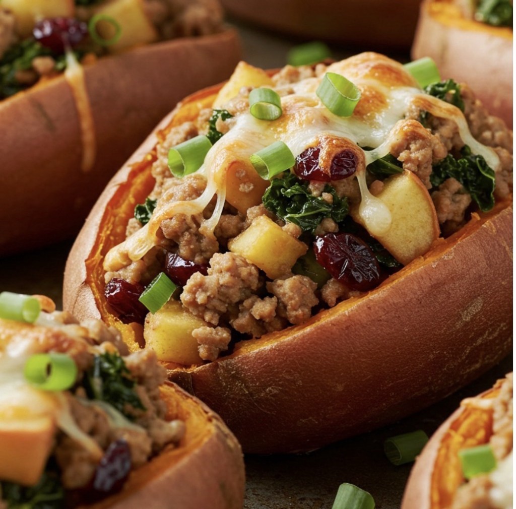 Harvest Stuffed Sweet Potatoes. This is another recipe that is going to find its way onto our menu very soon. I’m not sure where I discovered this. Maybe Pinterest? It doesn’t really matter, it looks really interesting, with ground turkey, chopped apple, dried cranberries, and cheese.