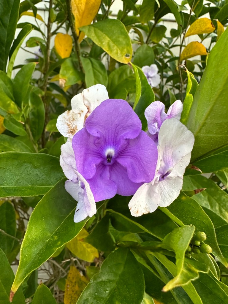 We spotted a small Brunfelsia grandiflora bush in bloom. Yesterday, today, and tomorrow, the common name for this plant, is one of my favorite blossoms at this time of year. The flowers open as a vivid lilac, fade by the next day to pale lavender, and are white by the third day. The flower clusters on this plant didn’t give me a great shot of the intermediate hue, but it’s pretty nonetheless.