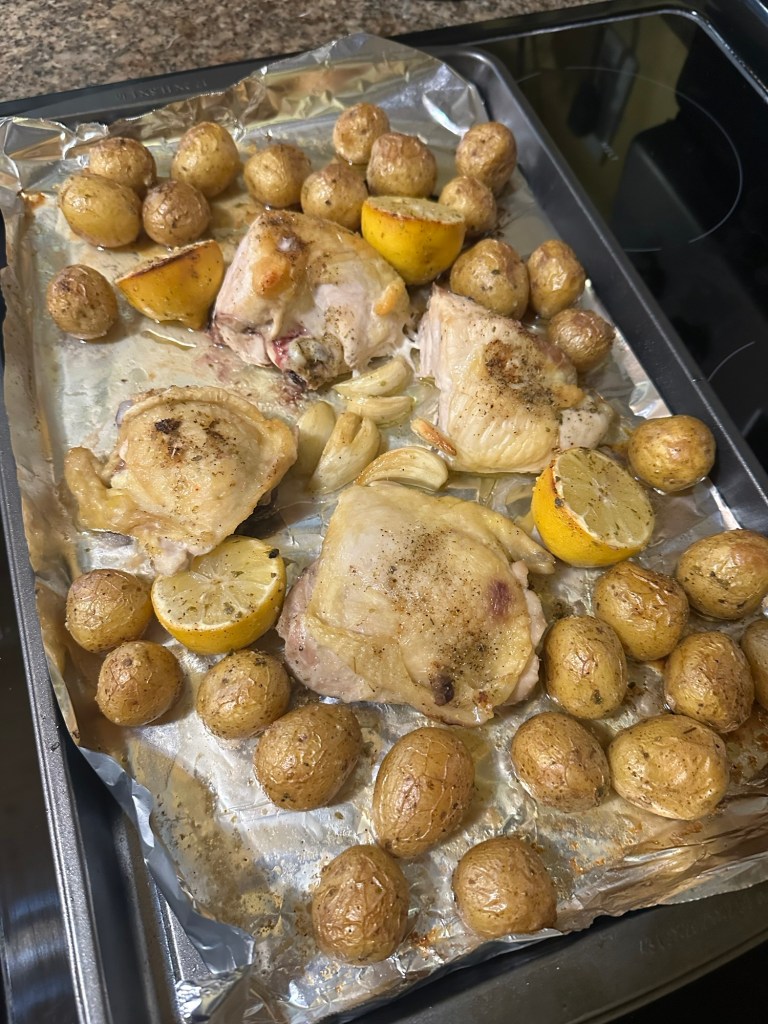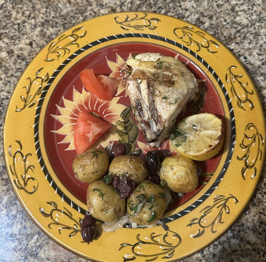 We have classified this dish as “a keeper.” I don’t think I’d change anything. I had planned to make some Greek salad as an accompaniment, but we sat down with an adult beverage while the chicken was in the oven, and decided we didn’t really need anything else. I cut some tomato wedges as a quick side. We’re going to eat the leftovers tonight; given that we ate more than half of the potatoes, the salad will definitely be in order 😄