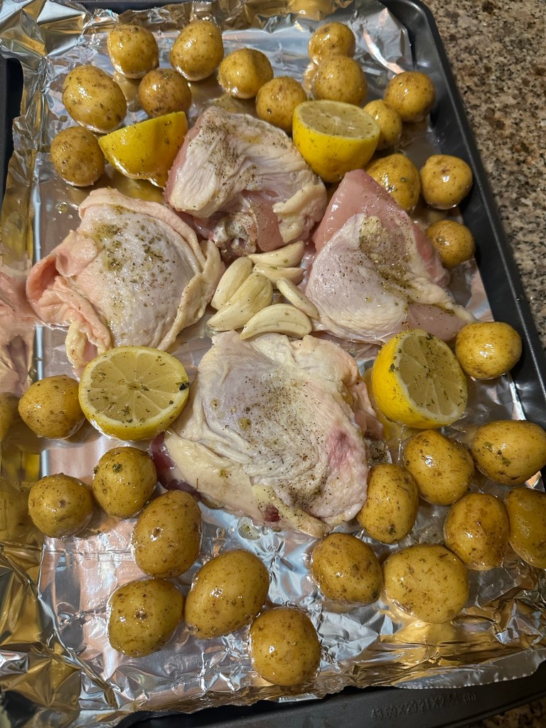 Yesterday was different, though. Our schedule has been off the past couple of months, and Ken planned to cook on Sunday, rather than his usual Tuesday. He had chosen a new recipe, Greek chicken and potato traybake from the Milk Street Tuesday Nights Mediterranean cookbook. However, when he read through the recipe again, he didn’t feel confident that he could manage the recipe, and asked if I’d help. I was delighted to do so. I’m sure he could have done it himself, but we ended up having a lot of fun working together.