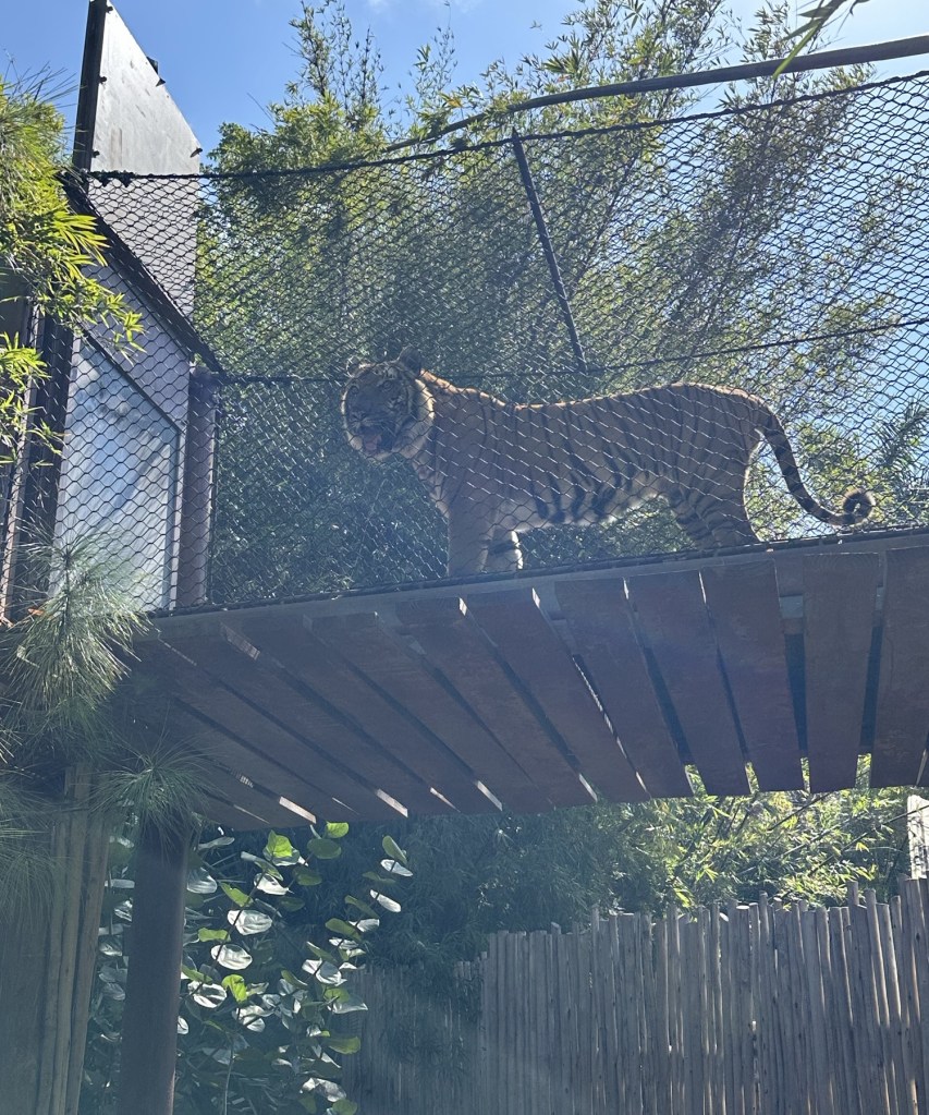 Although I was shooting into the sun and had the wire fence in the way, I have to share this final picture of one of the zoo’s three tigers. He was pacing that overpass to another section of the tiger habitat, but it was blocked at one end—probably to separate him from another tiger. A docent who was there told us that they keep the tigers separated, “or there will be fights.” We were just thrilled to be able to watch him for several minutes. I think he was doing as much watching as we were. His expression made me very happy that we had a barrier between us.