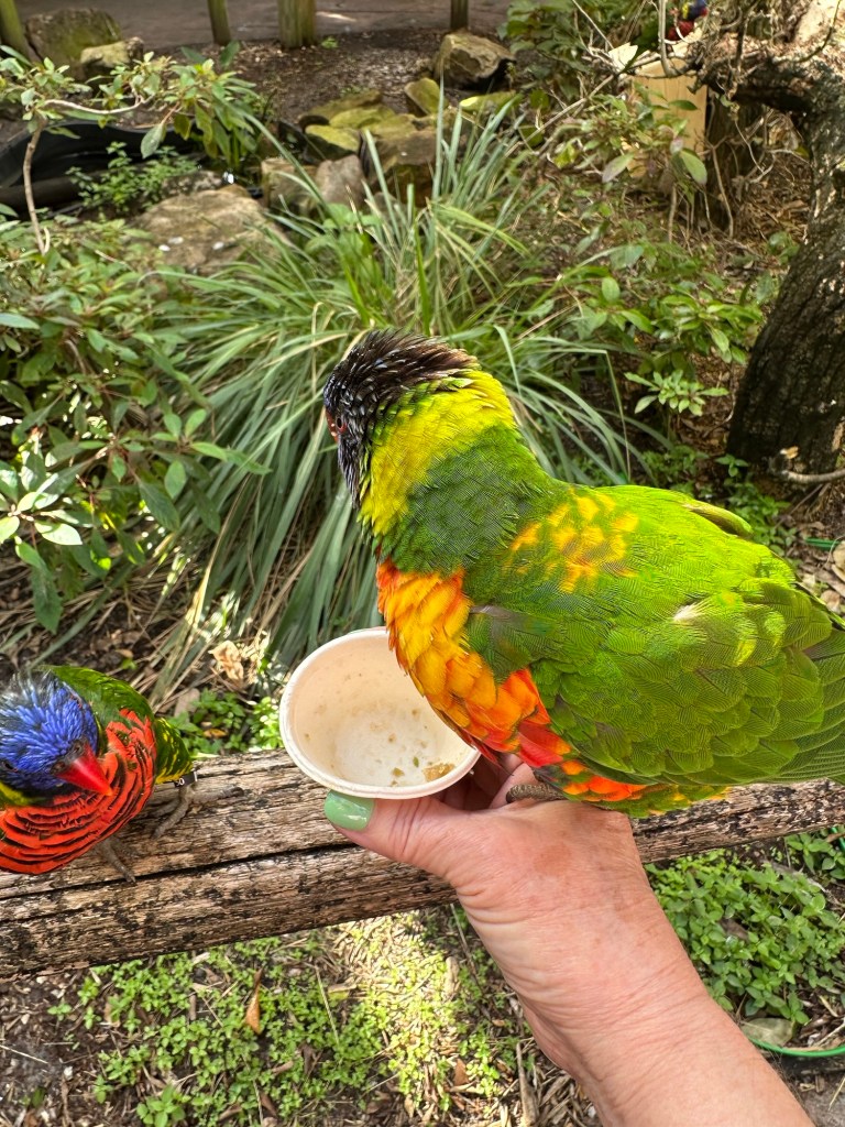 One area of the zoo that I remembered and wanted to visit again was the lorikeet habitat. Lorikeets are a type of parrot native to Southeast Asia and Australia. These are rainbow lorikeets from Australia, and guests can feed them. We didn’t do that the last time, but today I bought a cup of nectar and was soon very popular with the birds. Ken even got a picture of with three sitting on my arm.