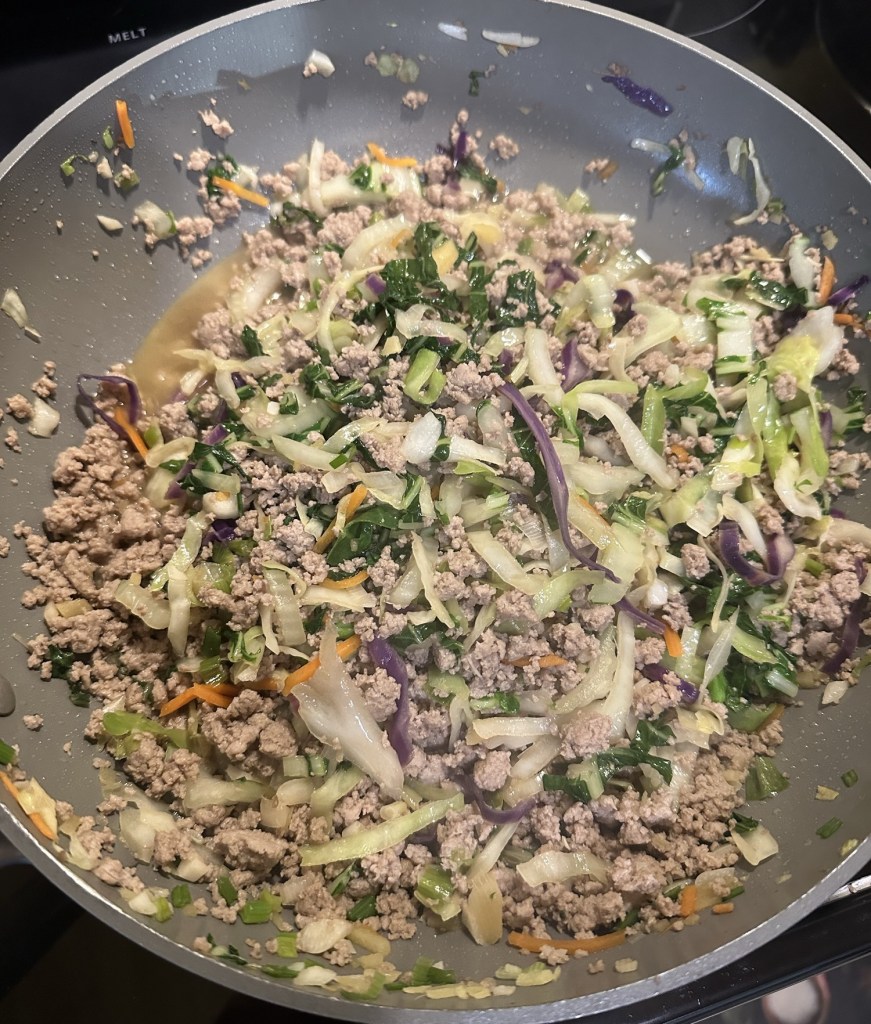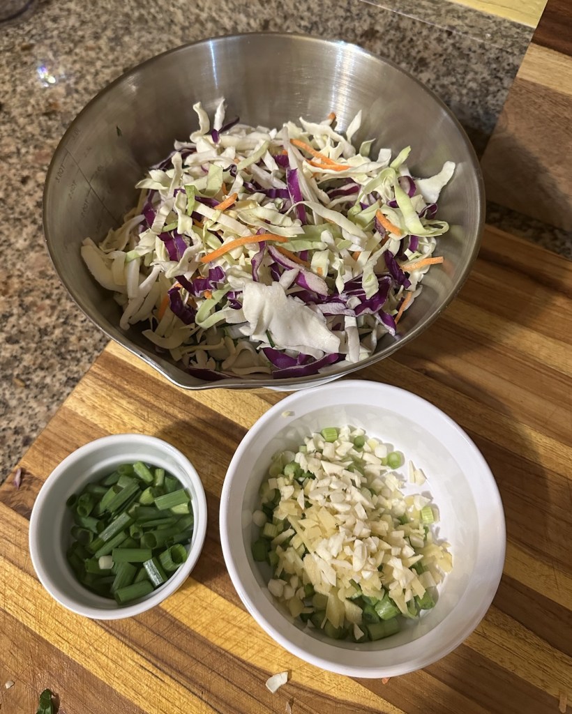 This dish highlights the vegetables, bok choy and slaw mix with cabbage. I couldn’t find the baby bok choy that the recipe specifies, but a regular bok choy worked just fine. I used tri-color slaw mix, with green and red cabbage plus carrots; I might try broccoli slaw mix next time, but just to try something different.