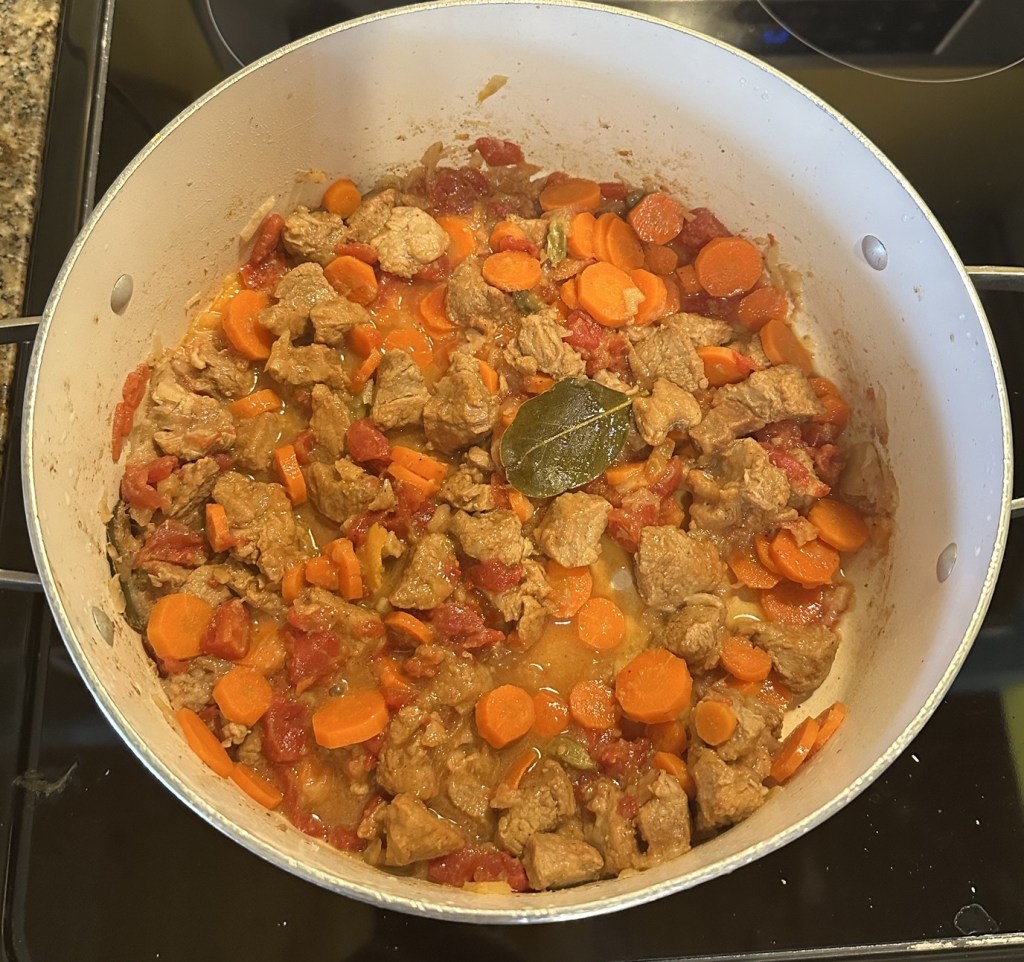 We didn’t have as much meat as the recipe calls for, but I didn’t cut the amount of any of the other ingredients. I made one other change. There’s an option of including cubed potatoes, which we decided not to include. Instead, because I really wanted an additional vegetable, I added sliced carrots. I’d never make it again without them. Oh, I made one emergency substitution: the recipe calls for whole coriander seeds, and I realized as I started my prep that I didn’t have any. Instead, I added a quarter teaspoon of ground coriander when I added the brown sugar. It worked out just fine.