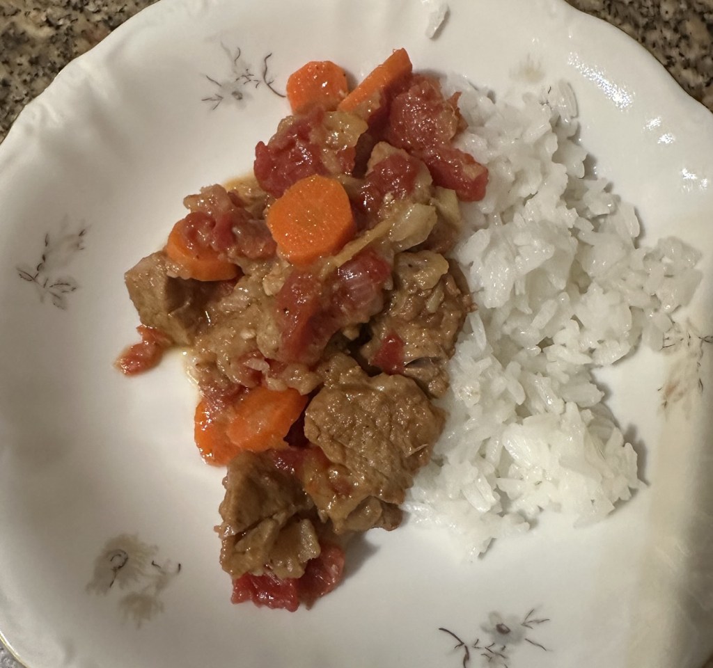 The result is a rather dry stew. As much as we love sauces, I wish there had been more. I actually added a little extra water when I added the carrots. We served the stew over jasmine rice. I’d planned to make pilaf, but I got caught up in the movie we were watching—we had a Netflix marathon—so opted for simple steamed fragrant rice. That was just fine, although I’m hungry now for my good pilaf 😄 Despite not being particularly saucy, it was delicious. We both enjoyed it very much, and I hope to make it again. It’s not as heavy as some stews, and would be a good warm weather dish, although I do tend to look for dishes where I don’t need to have the stove on for so long.