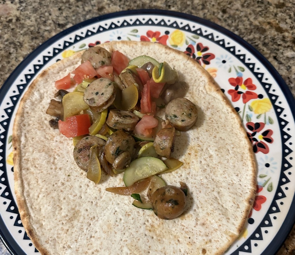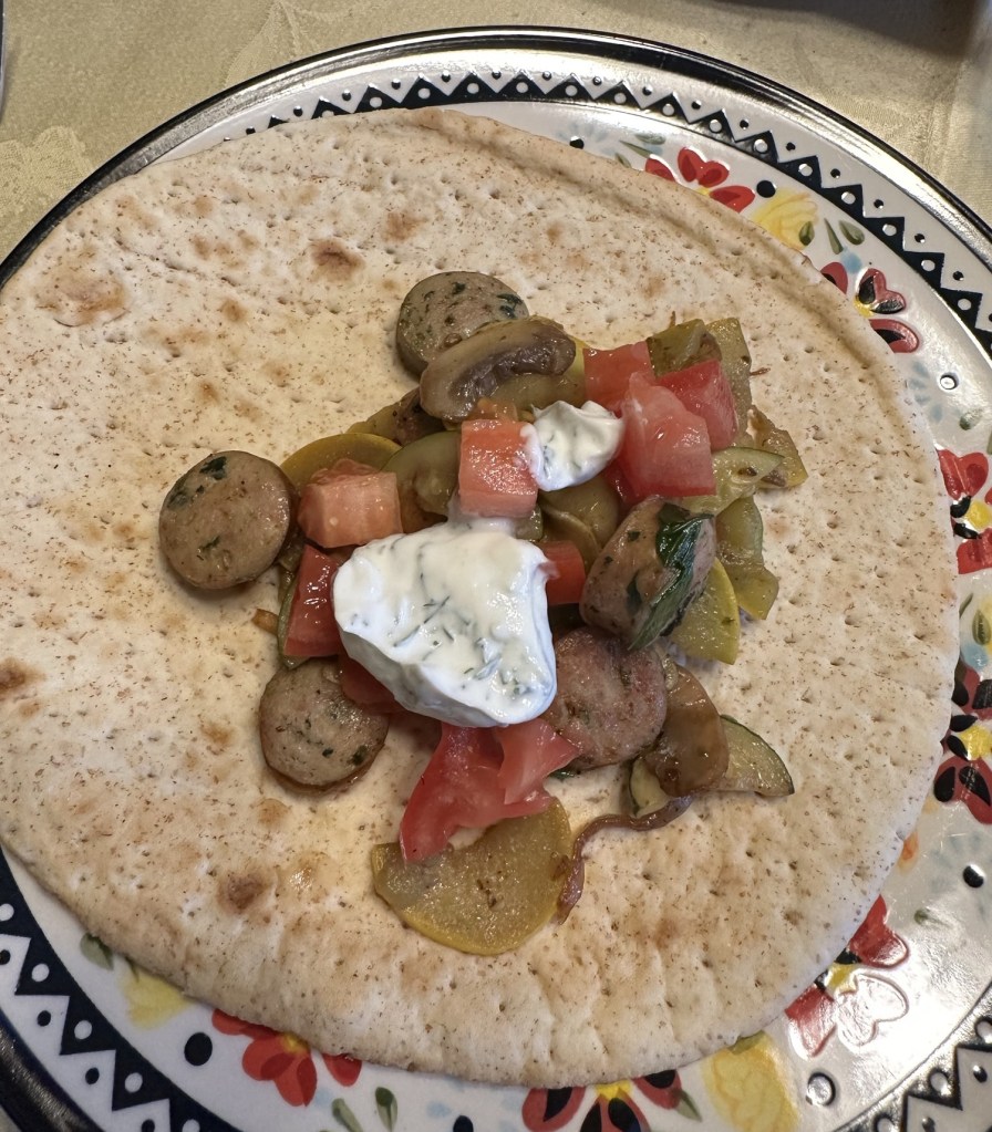 The dish is called chicken sausage and zucchini pockets, and is simple to prepare. Sliced fully cooked sausage is sautéed, as is sliced onion, mushrooms, zucchini, and yellow squash, then served in pita pockets with optional chopped tomato and tzatziki.
