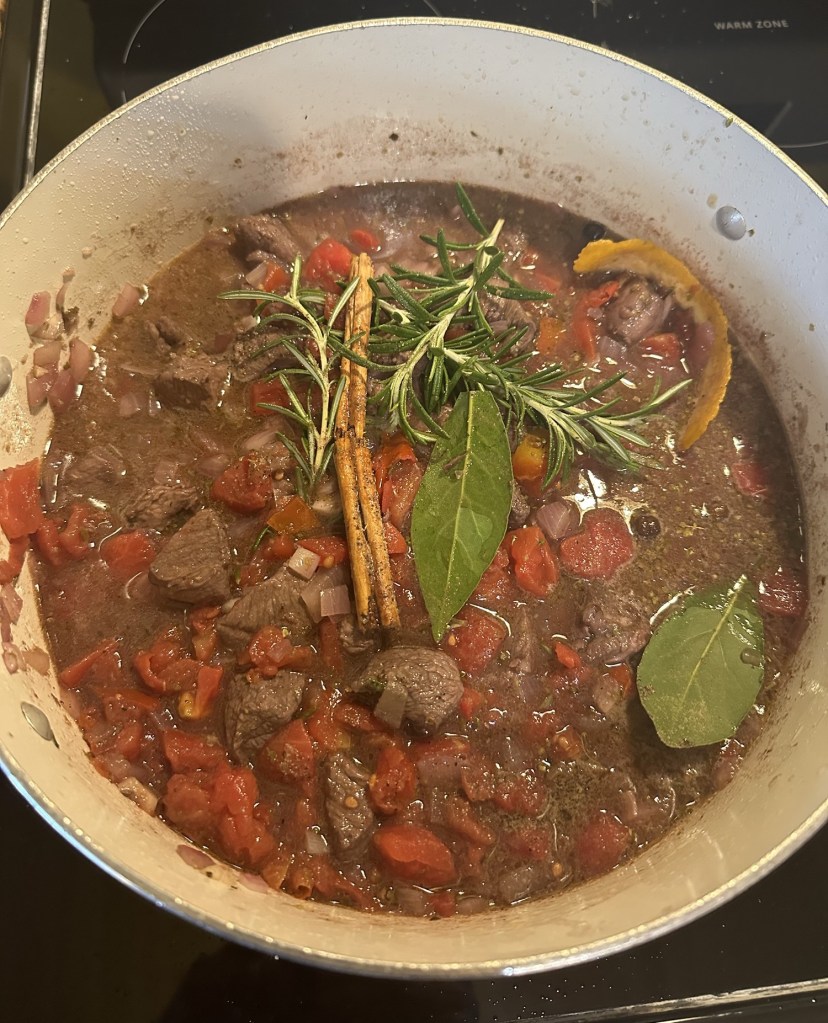 Reduce the heat to medium. Pour in tomatoes, remaining marinade, and 3/4 cup of red wine. Bring to a simmer, reduce heat, and add the orange zest, remaining rosemary (whole sprigs), 2 teaspoons of oregano, cinnamon stick, allspice berries, and bay leaves. Season with salt and pepper (I used very little salt—maybe 1/2 teaspoon kosher salt and 1/2 teaspoon pepper). Cover and cook over low heat for about 2 hours, or until lamb is very tender.