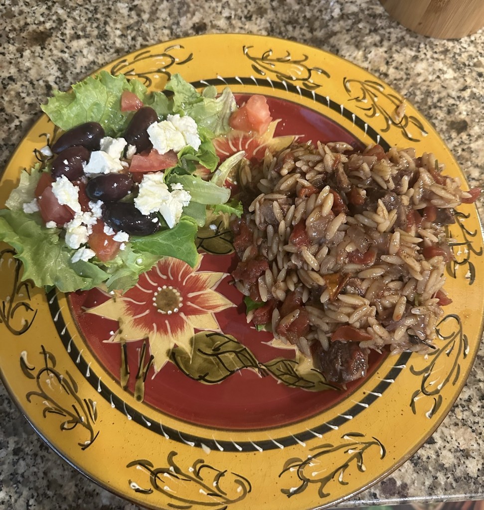 The Greeks really know how to cook lamb perfectly. I marinated the cubes, which I suspect were from a leg, in a red wine-olive oil-garlic-herb mixture. The directions said to marinate for up to four hours. I didn’t get started until after we got home from church, so the meat was only in the marinade for a little over an hour, but the flavors definitely penetrated the meat. Plus, it was falling apart tender. The sauce also had plenty of wine and herbs, as well as tomatoes and onion. The orzo cooks in the sauce for the last 30 minutes, so everything is infused with the wonderful flavor. I think I spent as much time in the kitchen lifting the pot lid and sniffing the aroma as I did putting the dish together.