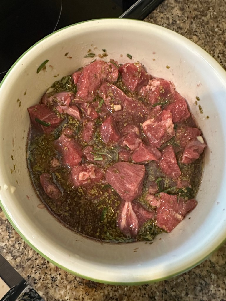 Finely chop 3 cloves of and, in a large bowl, combine them with the chopped leaves from 3 sprigs of rosemary, 1 tablespoon oregano, 2 tablespoons olive oil, and 1/2 cup red wine. Marinate lamb in this mixture, covered and refrigerated, for at least one hour or up to 4.