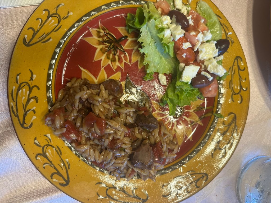 I ended up changing proportions, because I only had one pound of lamb, rather than the two pounds called for. Normally, I’d just halve the meat and make a full batch of sauce. But since the orzo cooks in the sauce and I wanted to cut that amount back too, I made some adjustments. I ended up reducing the amount of wine, olive oil, and chicken stock. I was so pleased with the results, I’m including the recipe with my changes. Since I halved the meat but used two-thirds of the orzo called for, there’s less meat to pasta than the original. Ken says that’s probably more like what we’d find in Greece, anyway.