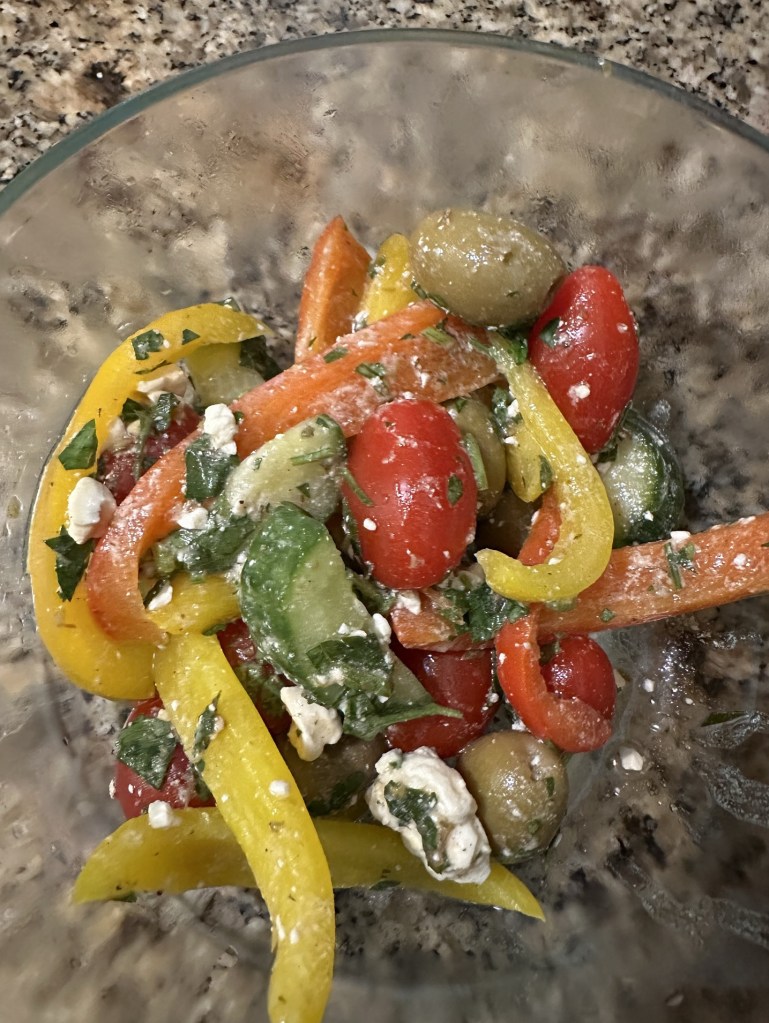 The recipe calls for serving the fish with pearl couscous, which is what we did. We picked up a cucumber and tomato salad with feta at Whole Foods when we bought the fish, to serve on the side. It also included olives and bell peppers, and turned out to be very similar to the horiatiki that I make. Truthfully, I think mine is better, but at least I didn’t need to worry about making a side.