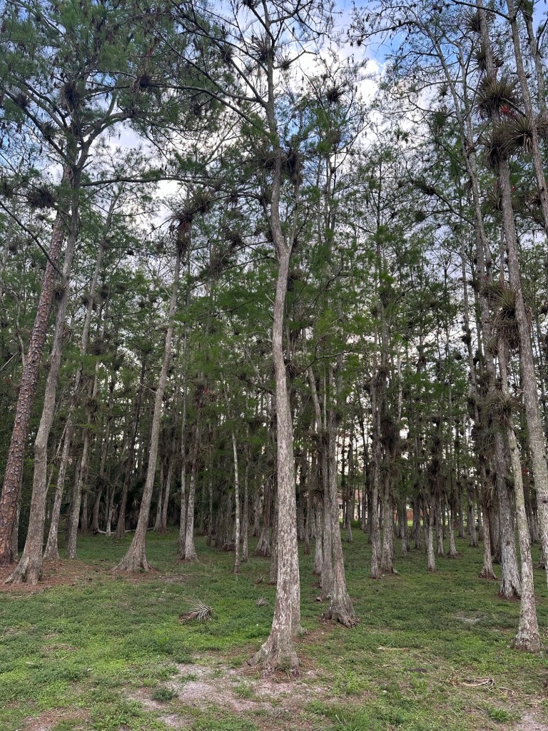 Along one of our regular walking routes, there’s a sign for one of the neighborhood parks found throughout our community, as well as a paved path between two houses. We’d never walked that path until recently, and we took it again a couple days ago. The path leads into the quiet oasis of a cypress stand. How delightful it must be to have this in your backyard! There’s playground equipment and a basketball court close to the street, but it’s such a peaceful spot. I want to go and just sit there some day.