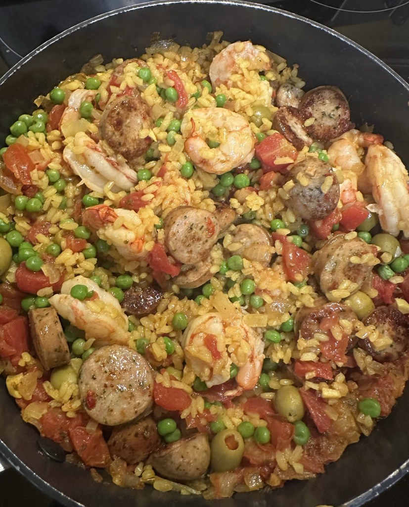 My paella was mixta style, incorporating both meat and seafood. The recipe calls for boneless chicken breast and shrimp. I replaced the chicken with smoked chicken sausage. There are so many protein variations in different recipes. One of the recipes I tried previously included sausage, and we really liked it, especially the sausage with roasted red peppers and queso fresco that I used this time.