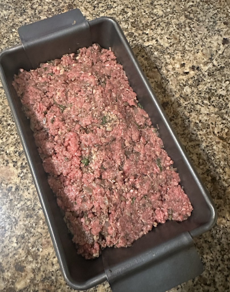 I was going to say that I don’t make any changes to the recipe, but I actually did make one this time. The recipe calls for 1.5 pounds of meat, but I only had a 1.25 pound package. I worried that 2 eggs would result in the meatloaf being really soft. I mixed in one egg, and liked the consistency of the mix, so I didn’t add the second. The result was delicious. I’m presenting the original version, because that’s how I usually make this.