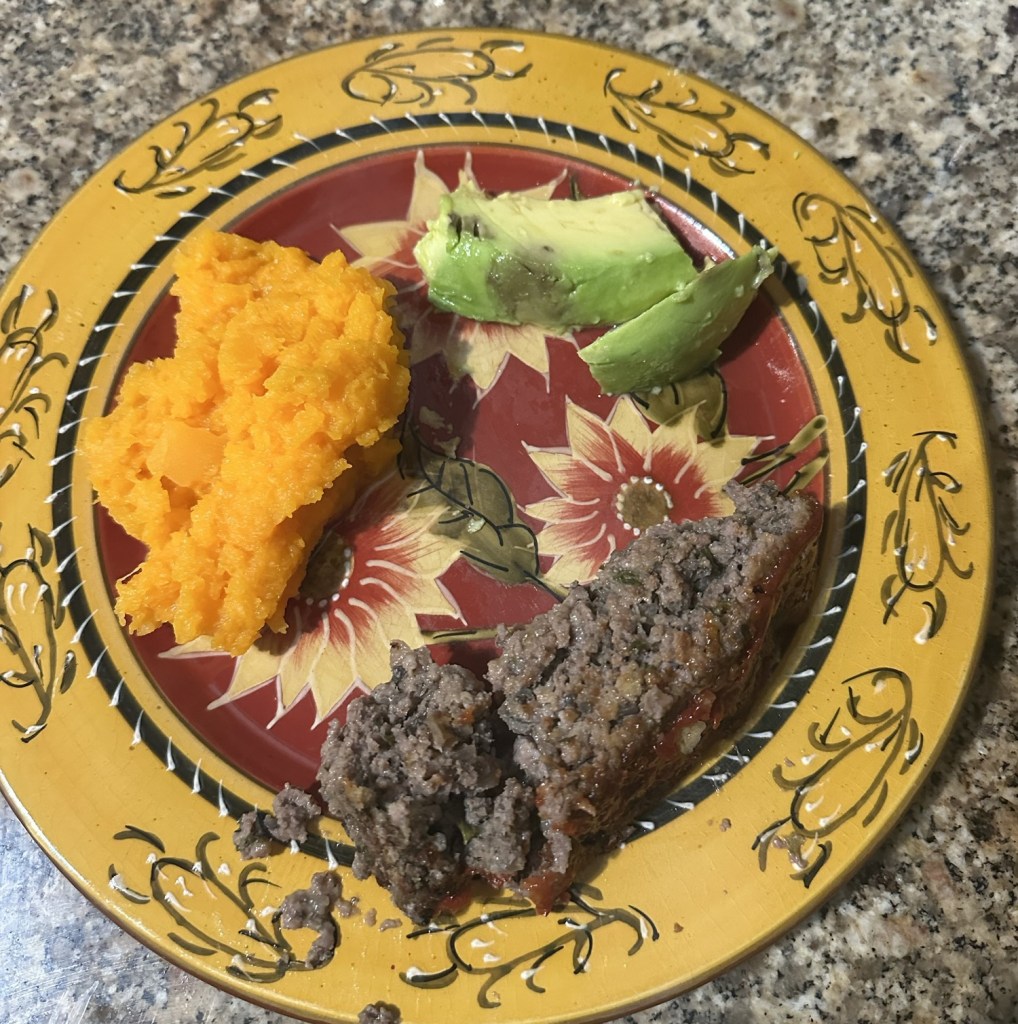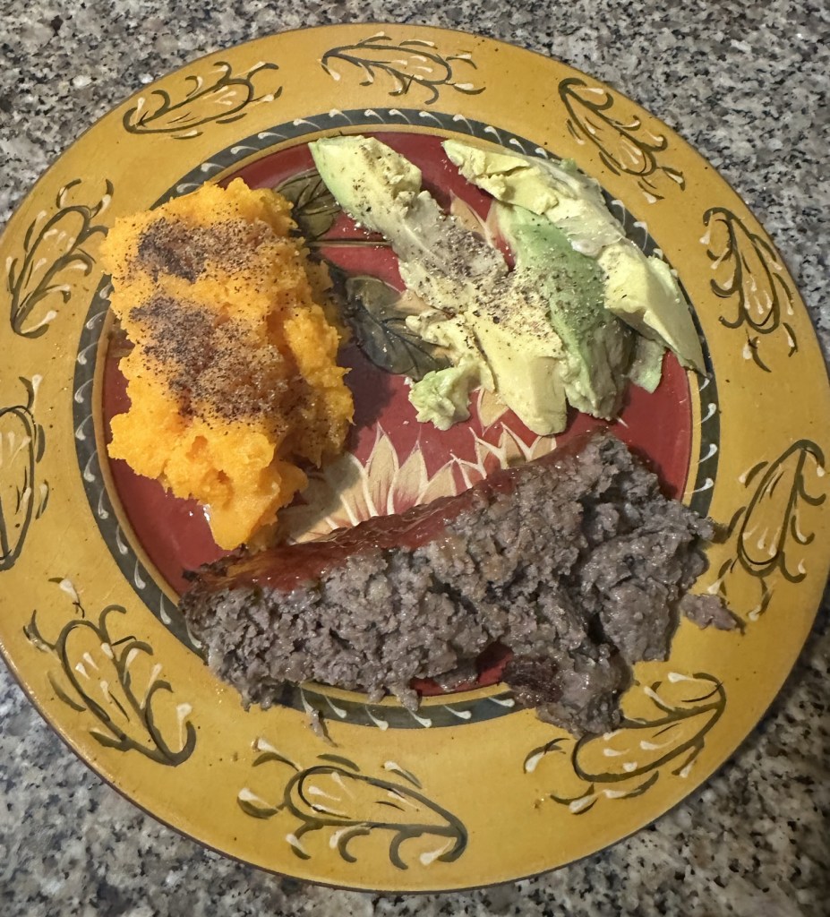 Rather than mashed potatoes, I mashed a butternut squash. We also had a ripe avocado, which I dressed with a little lemon juice. It was a pretty tasty dinner.